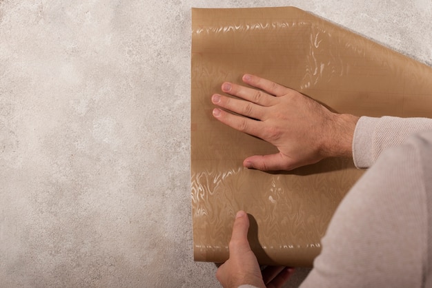 После нанесения клея, рулонные обои аккуратно прикладываются к стене, начиная с верхнего края. Важно выравнивать обои и удалить возможные пузырьки воздуха или излишки клея, используя пластиковую шпателю. Обратите внимание на рисунок на обоях и постарайтесь правильно сочетать мотивы при укладке.