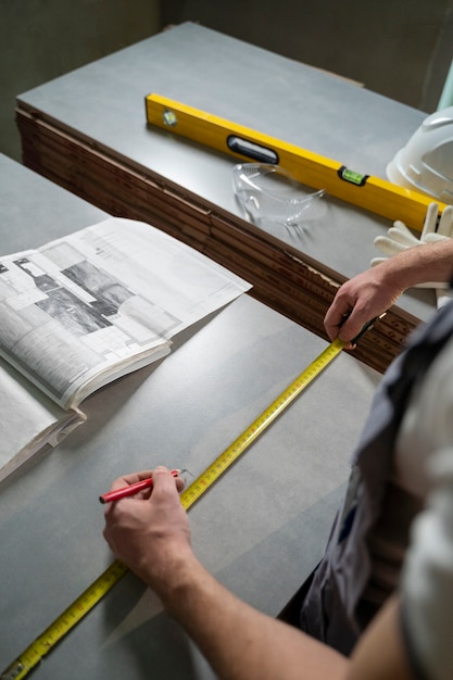 Отметьте полученную длину на ламинате и проведите линию с помощью линейки или угольника.